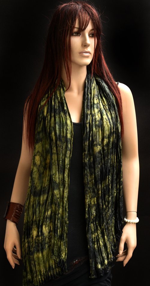 Echte zijden boho chic krinkelsjaal, zwart met mos groene tinten, 180 x 90 cm, handgeschilderd door Ineke.