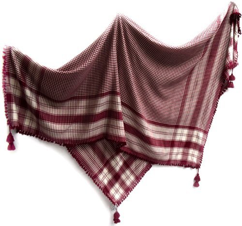Mooie grote casual vierkante sjaal met ruitjes en streepjes, heeft bordeaux rode franjes en flossen. Wit en bordeaux, goede kwaliteit. 120 x 120 cm
