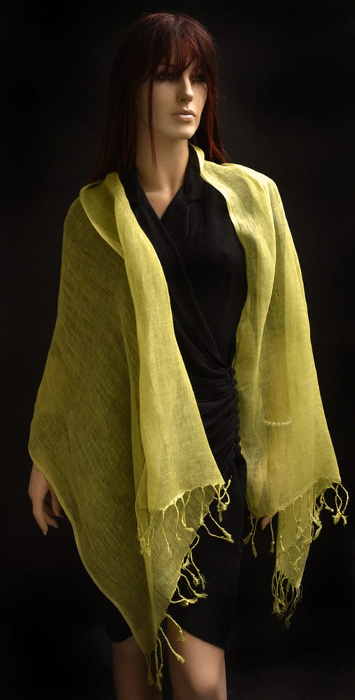 Lichtgroene, olijfkleur linnen sjaal met franjes