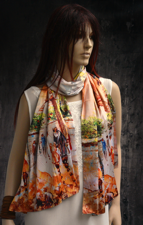 Prachtige chique soepelvallende glanzende sjaal met op de voorkant een romantisch Parijs tafereeltje met de eifeltoren op de achtergrond en op de achterkant een ander schilderij. Kleuren: Geel, oranje, oker, bruin, cognac, offwhite, lichtgrijs, groen, roze, blauw, rood, zalm, etc..