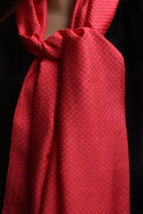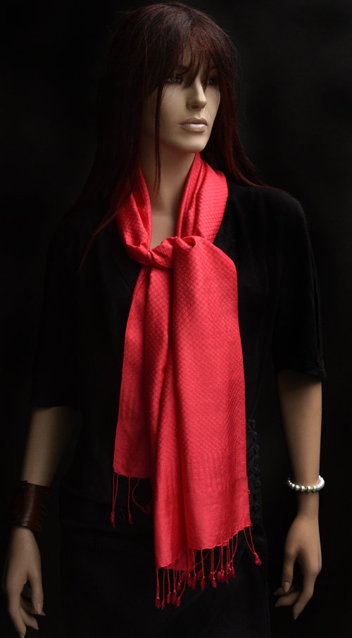 Prachtige rood roze zijden sjaal met franjes, beetje glanzend, de zijde heeft een mooi ruitje in de stof ingewerkt. Jacquard. Zeer mooie klassieke en chique uitstraling, heel geschikt voor warme lentetypes. 170 x 48 cm.